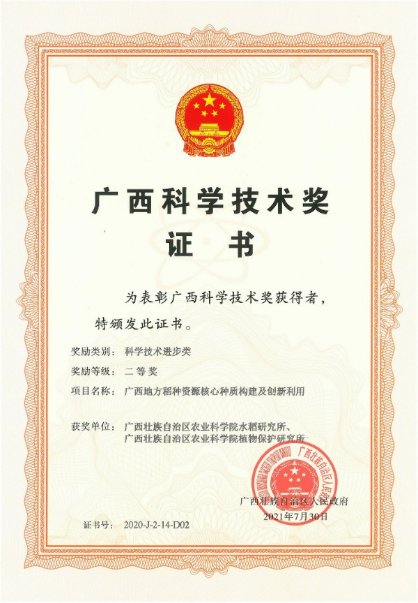 广西地方稻种资源核心种质构建及创新利用 2020年广西科学技术进步奖二等奖