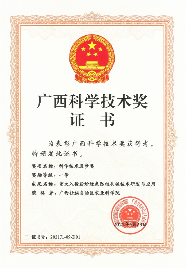 重大入侵粉蚧绿色防控关键技术研发与应用 2021年广西科学技术进步奖一等奖