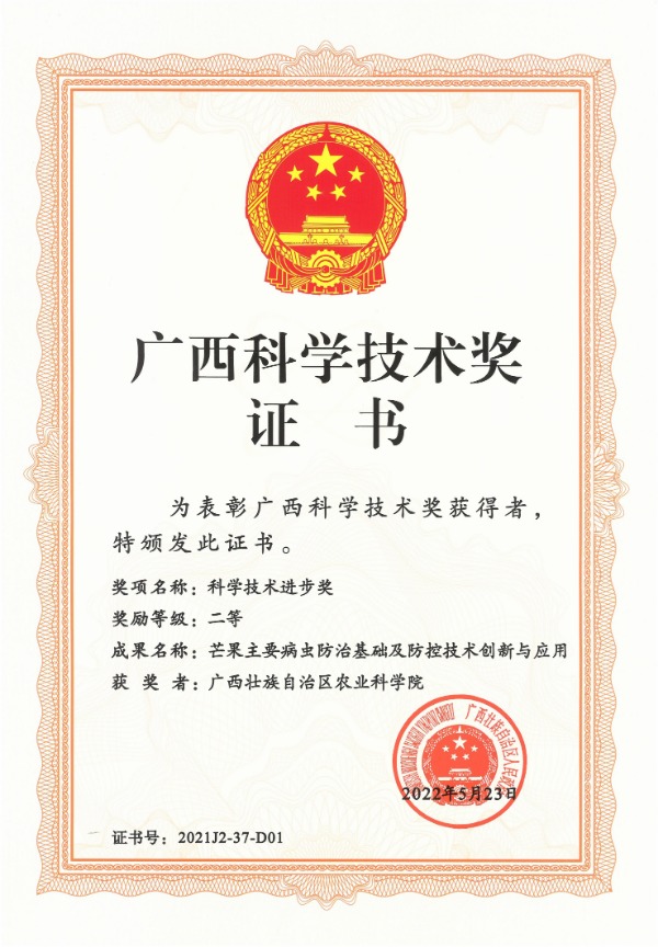 芒果主要病虫防治基础及防控技术创新与应用 2021年广西科学技术进步奖二等奖