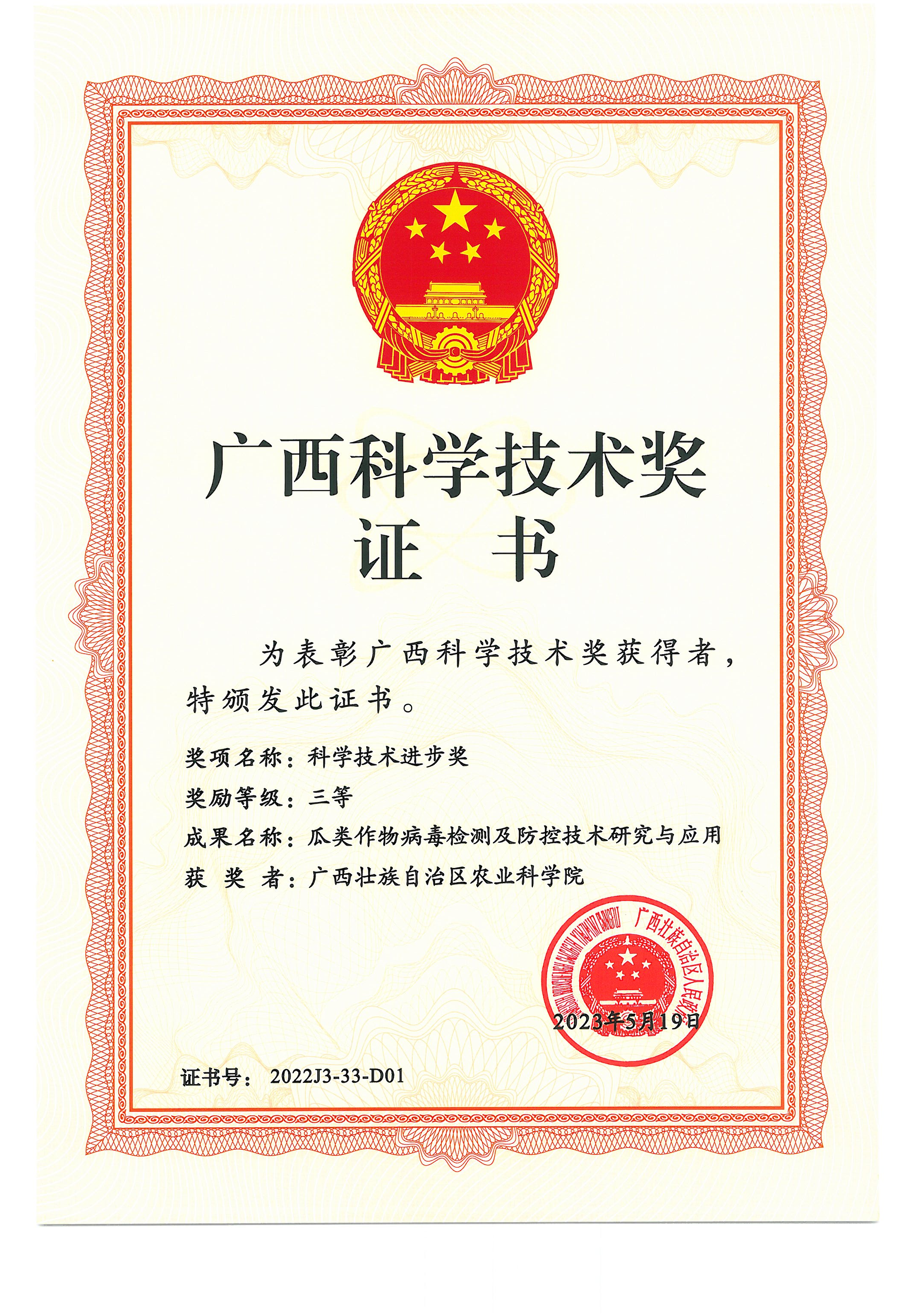 瓜类作物病毒检测及防控技术研究与应用 2022年广西科学技术进步奖三等奖