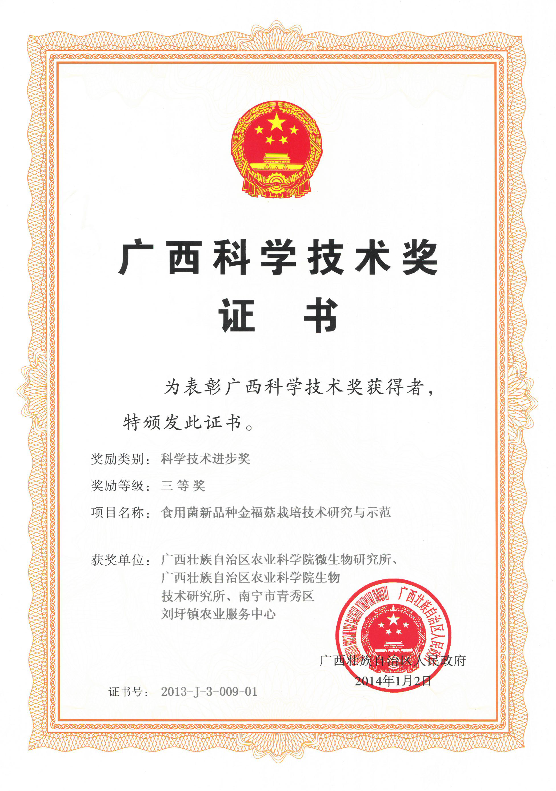 广西科学技术进步奖三等奖-食用菌新品种金福菇栽培技术研究与示范