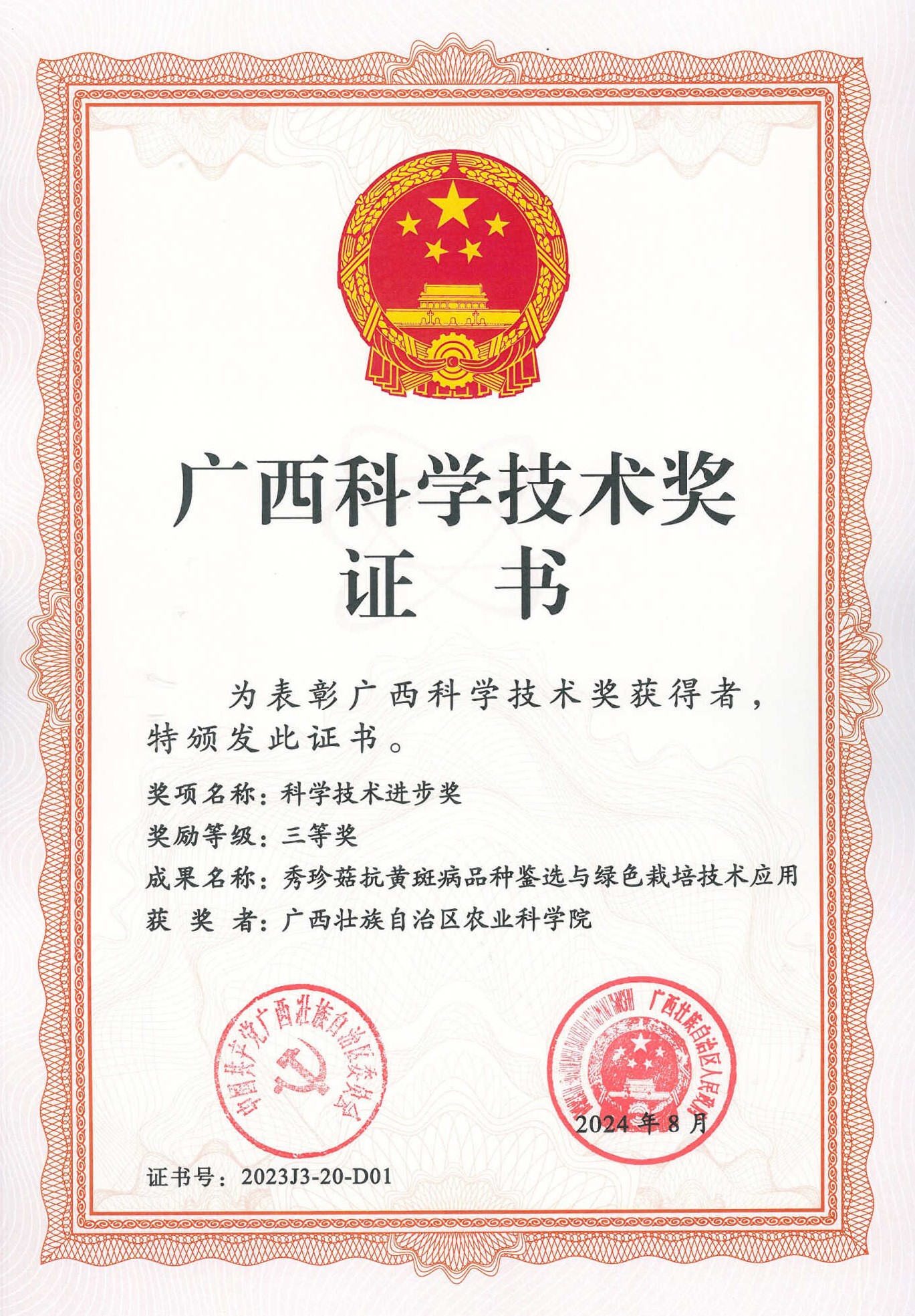 广西科学技术进步奖三等奖-秀珍菇抗黄斑病品种鉴选及绿色栽培技术应用