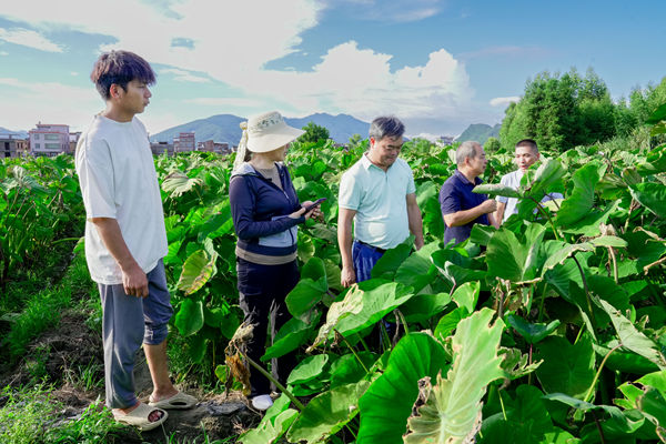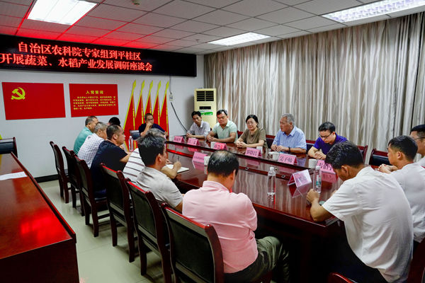 在贺州市平桂区农业局,蒋慧萍等一行与当地农技人员、种植大户就马蹄、水稻种植管理中高温天气病虫害发生情况及水稻-马蹄轮作种植模式及效益等进行座谈交流会,并就品种选择、茬口安排及病虫害防治等提出具体建议和指导。随后到鹅塘镇丹村对华顺合作社种植的“桂蹄3号”品种进行回访,了解到该品种在田间抗性、产量及大果率方面表现甚优,得到当地种植户充分肯定。在钟山县,江文针对钟山庆锡种养合作社当前马蹄分株旺盛期及芋头膨大期后期田间管理中肥料施用及病虫害防治技术及注意事项,提出具体建议和指导。在桂林市平乐县,科技人员与宏源农业发展公司负责人翟品球,就今年粉马蹄种植、加工及加工副产物利用等循环农业等进行交流和讨论,并到其种植基地就马蹄田间管理、密度控制等进行指导。在桂林市荔浦县青山镇香芋种苗繁育基地和南宁市武鸣区美泉种苗生产企业,分别就香芋组培苗种苗繁育及马蹄组培苗生产继代等进行了调研和指导。