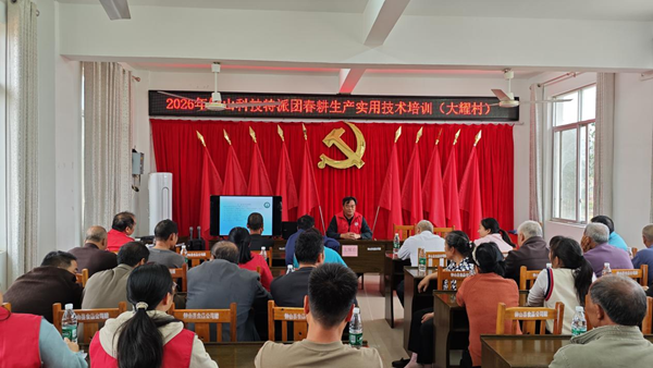 在钟山镇大耀村,召开了钟山县“一县一团”2025-2026年度服务管理工作会议暨春耕春种服务推进会。会上,江文对2025年科技特派员进行了工作总结,部署了2026年重点工作,强调围绕钟山县特色产业开展精准服务,提高科技含量,促进产业兴旺。还作了题为“香芋提质增效栽培技术”的专题培训,讲解了种芋选择、选地整地、化肥农药科学使用及病虫害绿色防控等技术要点,钟山县基层农技人员、钟山县乡村科技特派员成员及种植户代表共40余人参加。