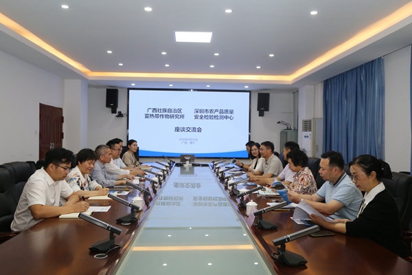 3月31日,深圳市农产品质量安全检验检测中心党委委员、副总监彭建清一行5人到广西热作所调研交流,院党组成员胡茂林,热作所党委副书记、纪委书记梁声侃,党委委员、副所长覃剑峰、冯春梅及相关部门负责人参加会议。