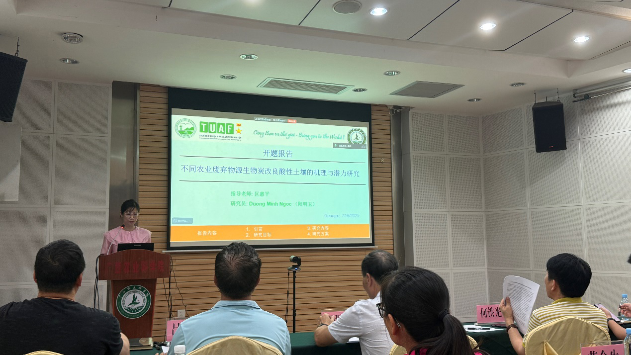 6月11日下午,来自越南的东盟杰出青年科学家Duong Minh Ngoc在院学术交流中心作了题为“不同农业废弃物源生物炭改良酸性土壤的机理与潜力研究”的开题报告。Duong Minh Ngoc是通过自治区科技厅实施的“百名东盟杰出青年科学家来华入桂工作计划”引进到我院的青年专家,将在资环所开展为期一年的课题研究工作。咨询专家组中国科学院亚热带农业生态研究所李德军研究员、福建农林大学蒋瑀霁教授、广西大学顾明华教授、广西林业科学院唐健研究员以及自治区科技厅科技人才与科普处主任童彬、自治区科技厅东盟杰出青年科学家来华入桂工作项目主管张夏,资环所所长何铁光、副所长黄金生,部分东盟杰青科学家、其他科技人员等近30人参加报告会。院中国-东盟国际农业科技创新院副院长吕荣华主持会议。