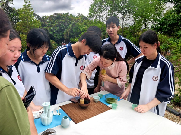 在茶园基地中,科技人员结合广西热作所茶叶科研成果,为学生讲解茶树生长规律与茶粮间作的生态种植模式;接着,带领学生们走进加工车间,了解六堡茶蒸压和陈化工艺,在科技人员的指导下学生们近距离观察了解红茶、绿茶、白茶、六堡茶和茉莉花茶的特征,深入学习茶类间的差异。期间,团队成员还展示了宋代点茶和现代茶饮调制技艺,让学生们在古今茶文化的碰撞中,领略到茶的多元魅力。