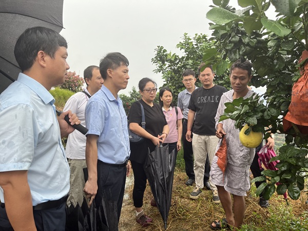 首先在荔枝种植园、鸿运香柚产业园基地,开展现场调研与技术指导。经广西农科院驻卖酒村第一书记黄其椿介绍基本情况后,园艺所专家团队针对卖酒村党员干部、种植户提出的问题进行详细指导,专家现场示范了荔枝“高接换种”技术操作,讲解嫁接时的切口角度、绑扎力度、后期养护要点。针对鸿运香柚产业园运营情况,园艺所专家提出“标准化种植是提升香柚品质、打造品牌的关键”,建议划分“示范种植区、技术培训区、产品展示区”,打造集“种植、培训、观光”于一体的现代农业产业园,推动单一种植向“三产融合”转型。