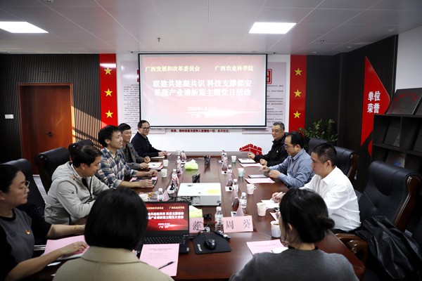为深入学习贯彻党的二十届四中全会精神,推动党建工作与乡村产业振兴深度融合,以科研力量破解县域产业发展难题,1月15日,加工所党支部携手园艺所、蔬菜所党支部,联合自治区发展和改革委员会价格认证中心,共同开展“联建共建凝共识 科技支撑都安果蔬产业谱新篇”主题党日活动。活动由加工所党支部书记周主贵主持,园艺所副书记庞新华、蔬菜所副所长程亮、自治区发展和改革委员会价格认证中心主任王国祥及党员代表、科研骨干共同参与。