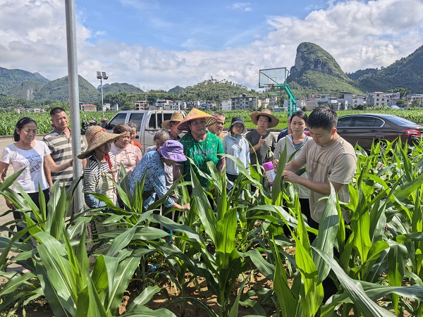9月11日上午,河池分院玉米产业科技先锋队联合金城江区农业技术推广站一行5人,到金城江区六圩镇都腊屯开展玉米草地贪夜蛾防控技术指导,实地向农户们讲解:草地贪夜蛾幼虫最明显的特征是头部有倒“Y”字型纹,尾部有四个呈正方形排列的黑点。一般在30天完成一个世代,低龄幼虫(1-3龄)多隐藏在玉米心叶内部啃食叶片,形成半透明薄膜“窗孔”;高龄幼虫(4-6龄)会将叶片咬成不规则孔洞或完全吃光,严重时导致生长点死亡。用药时着重点施玉米心叶。会后,发放了防治药物氯虫苯甲酰胺颗粒剂300份。