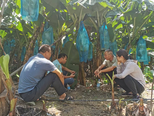9月12日,玉林分院香蕉综合试验站成员一行4人分别到博白县文地镇、陆川县良田镇等香蕉基地开展产业调研并指导香蕉病虫害防控。在陆川县良田镇康益生态种植家庭农场,目前种植的桂泰粉1号抽蕾率约30%,试验站成员与基地负责人深入交流蓟马等蕾期主要虫害绿色防治技术。博白文地香蕉基地目前已进入采收期,田间香蕉枯萎病发病率在5% 左右,如果任由其发展,下一季枯萎病将会扩大,试验站成员指导基地管理员可以通过采用香蕉“三剂”(生防菌菌剂、杀线虫剂、防腐烂剂三种药剂)组合技术并配合海藻素或腐殖酸水溶肥灌根使用,以调节土壤环境、抑制病原菌繁殖,达到防控枯萎病的效果。