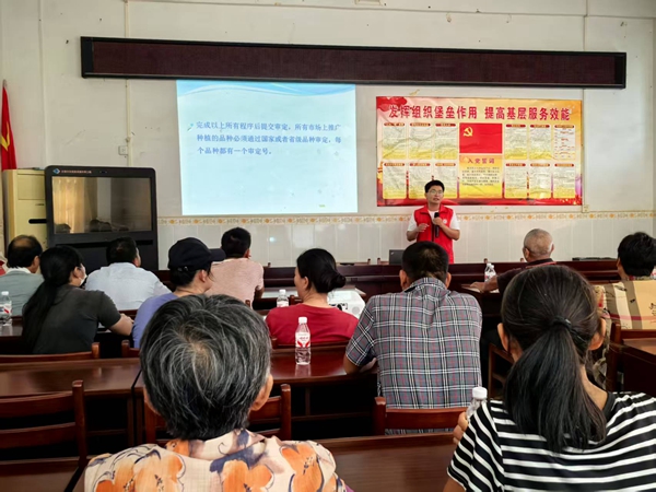 培训会上,陈海凤和梁林生分别进行水稻优良主推品种介绍、水稻高产栽培技术及水稻病虫害防治技术授课,从品种特性、栽培技术要点、主要病虫害防治等方面深入浅出为参会人员讲解相关知识;会后,科技人员到田间现场讲授水稻病虫害知识,为农户解答实际生产上遇到的难题。
