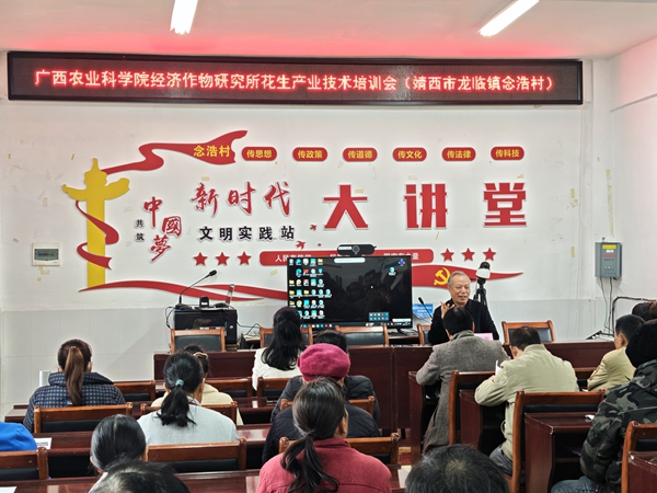 培训会上,广西农业科学院经济作物研究所研究员唐荣华博士、正高级农艺师蒋菁深入分享了花生间套种复合种植、花生良种及高产高效栽培技术要点,重点围绕如何扩面积提单产和新品种桂花黑3号高效种植技术深入浅出讲解和经验分享;百色分院、国家糖料体系百色综合试验站、广西玉米创新团队百色综合试验站、广西柑橘创新团队桂西北综合试验站的科技特派员分别就“甘蔗优新品种及高产栽培技术”“粒用玉米高产栽培技术及病虫害防治要点”“农药科学施用”进行授课,课件图文并茂,内容丰富,结合生产实际案例作典型分享,直观而生动;培训现场互动答疑,还发放200斤优质黑花生、80袋黑糯玉米种子。