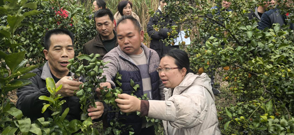 2月5日,团队深入古障镇、八达镇、那劳镇产业一线,开展“组团式”科技服务,进行柑橘黄龙病诊断培训,提升基层农技人员和种植户对黄龙病的识别、监测与防控能力;针对沙糖桔采后清园修剪难点,通过“理论+实操”,现场演示“剪除病弱枝、改善通风、补充营养”等技术并开展修剪培训。